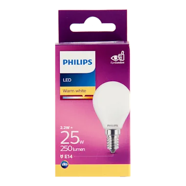 | Philips LED kogellamp bestellen? | Deze ledlamp van Philips biedt warmwit licht dat comfortabel is voor de ogen. Met dit warme licht creëer je gemakkelijk een rustgevende sfeer. De lamp geeft warm licht met een lichttemperatuur van 2700 K. Deze lamp heeft een lichtopbrengst van 250 lumen. Bovendien biedt deze energiezuinige ledlamp 15000 lichturen. De lamp heeft energielabel A++. | Vervang je oude kleine kogellamp met een nieuwe energiezuinige Philips LED-lamp, met warmwit licht. Deze lamp verbruikt circa 80% minder energie dan traditionele lampen dankzij de nieuwste energiezuinige LED-technologie en ze gaan tien keer langer mee. Met EyeComfort, voor licht dat aangenaam is voor jouw ogen. Deze lamp heeft een E14-fitting, en past dus in de meeste lampen met kleine fitting. | Branduren: 15000 uur |