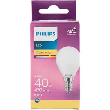 Vervang je oude kleine kogellamp met een nieuwe energiezuinige Philips LED-lamp, met warmwit licht. Deze lamp verbruikt circa 80% minder energie dan traditionele lampen dankzij de nieuwste energiezuinige LED-technologie en ze gaan tien keer langer mee. Met EyeComfort, voor licht dat aangenaam is voor jouw ogen. Deze lamp heeft een E14-fitting, en past dus in de meeste lampen met kleine fitting.