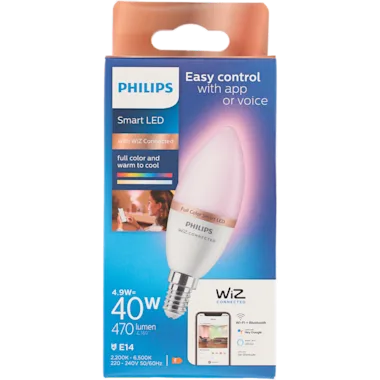 Geef elke ruimte kleur met de prachtige lichttinten van de gekleurde Philips Smart LED kaarslamp met E14-fitting. De lamp is eenvoudig te bedienen via de WiZ app. Zo kun je de lampen gemakkelijk dimmen, feller zetten of één van de voorgeprogrammeerde lichtscènes kiezen. Gebruik ritmes om je lampen op bepaalde tijden automatisch van wittint of kleur te laten veranderen. Je kunt de ritmes naar wens aanpassen door verschillende dynamische lichtscènes te combineren. Wat dacht je van lampen die doen denken aan een kleurrijke herfstdag, een groene jungle of een prachtige oranje zonsondergang? Gemakkelijk te bedienen via je eigen wifinetwerk met de WiZ app of je stem.