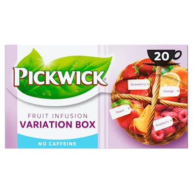 In dit Pickwick fruitvariatiedoosje zitten 4 heerlijke fruitinfusies met echte stukjes fruit: aardbei, sinaasappel, perzik en framboos. In deze fruitinfusies zit geen thee, dus ook geen cafeïne.