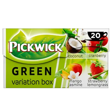 In het Pickwick Groene Thee Variatiedoosje zitten de heerlijke smaken kokosnoot, cranberry, mango-jasmijn en aardbei-citroengras. *Theesoort: Groene thee *4 smaken in één doosje, fris en zoet van smaak: kokosnoot, cranberry, mango-jasmijn en aardbei-citroengras *Voor ieder wat wils *Afkomstig van een Rainforest Alliance gecertificeerde theeplantage *Voor ideale bereiding: 2-3 minuten laten trekken pure taste