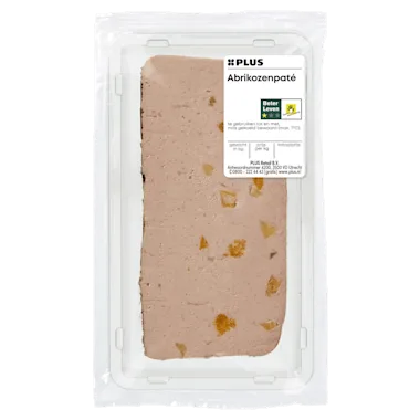 25% Varkenslever*, varkensvet*, MELK**, 13% varkensvlees*, 12% gedroogde abrikozen (94% abrikoos, rijstbloem, conserveermiddel: E220 (SULFIET)), varkensbindweefsel*, SCHARRELEI, rijstbloem, nitrietpekelzout (zout, conserveermiddel: E250), voedingszuur: E262/E325, suiker, gebakken ui (SULFIET), honing, varkenseiwit, specerijen (o.a. MOSTERDZAAD), antioxidant: E300/E330, dextrose, natuurlijk aroma.