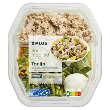 Ingrediënten :23% aardappel, 21% slamix (ijsbergsla, romaine sla), 14% tonijn (tonijn (VIS)*, water, zout), 13% vinaigrettedressing (water, raapzaadolie, uiengranulaat, MOSTERD (water, natuurazijn, MOSTERDZAAD, zout, kurkuma), witte wijnazijn, natuurazijn, suiker, SCHARRELKIPPENEI-EIGEEL, stabilisator: xanthaangom, gemodificeerd aardappelzetmeel, zout, gedroogde kruiden (peterselie, bieslook), specerijen (knoflookpoeder, witte peper)), 9% gekookt EI (SCHARRELKIPPENEI, zout, voedingszuur: E330/E331, conserveermiddel: azijnzuur), 9% sperziebonen, 7% wortel, 4% zwarte olijven (olijven, zout, stabilisator: E579, voedingszuur: E270).