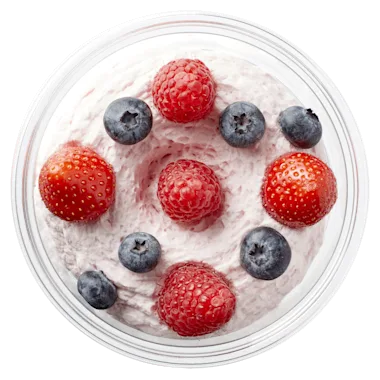 Ingrediënten :Magere MELK, plantaardige oliën (palmpit, raapzaad, palm, geheel geharde palmpit), 14% aardbei, 9% framboos, 9% blauwe bes, suiker, water, dextrose, glucose, rundergelatine, emulgator: E433/E471, SCHARRELKIPPENEI-EIGEEL, voedingszuur: citroenzuur, 0,1% framboospoeder, kleurstof: carotenen/bietenrood, stabilisator: E407, natuurlijk vanille aroma, natuurlijk aroma, zout.