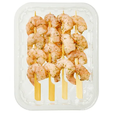 Rauwe, gepelde garnalen op houten spiezen, met 8% knoflookmarinade, ontdooid