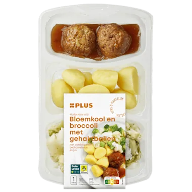 Ingrediënten :34% gekookte bloemkool-broccoli mix (66,6% bloemkool, 33,3% broccoli, zout, nootmuskaatextract), 30% gekookte aardappel, 16% gehaktbal (73% varkensvlees*, TARWEZETMEEL, VRIJE-UITLOOPKIPPENEI, paneermeel (TARWEBLOEM, zout, gist, ROGGE), gedroogde groenten (geroosterde ui, paprika, ui), ui, MOSTERD (water, MOSTERDZAAD, kurkuma, natuurazijn, zout, natuurlijk kruidenaroma), raapzaadolie, water, peterselie, gekaramelliseerde suiker, zout, kaliumchloride, ketjapsaus (suiker, melasse, water, SOJASAUS (water, SOJABOON, TARWE, zout), zout, natuurazijn, TARWEZETMEEL, natuurlijk aroma (bevat TARWE)), dextrose, specerijen, knoflookpuree, natuurlijke aroma's), 12% jus (water, gemodificeerd maiszetmeel, natuurlijke aroma's (bevat SELDERIJ), raapzaadolie, suiker, tomatenpuree driemaal geconcentreerd, conserveermiddel: E202, zout, rode wijnextract, kaliumchloride, wijnazijn, gekaramelliseerde suiker, verdikkingsmiddel: E406, specerijen, druivenmostconcentraat, geroosterd uienpoeder, gistextract, kleurstof: E150d), 8% bechamelsaus (water, MELKPOEDER, TARWEBLOEM, plantaardige oliën (zonnebloem, raapzaad), gemodificeerd maïszetmeel, zout, kaliumchloride, peterselie, room (MELK), glucosestroop, specerijen, MELKEIWIT, verdikkingsmiddel: E415, gistextract).