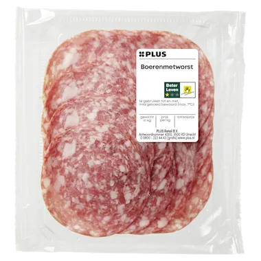 Voor 100 gram Boerenmetworst is 104 gram vlees gebruikt.