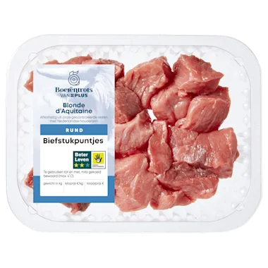 Het Blonde d'Aquitaine rundvlees heeft een 2 sterren Beter Leven keurmerk en komt van oorsprong uit Frankrijk.