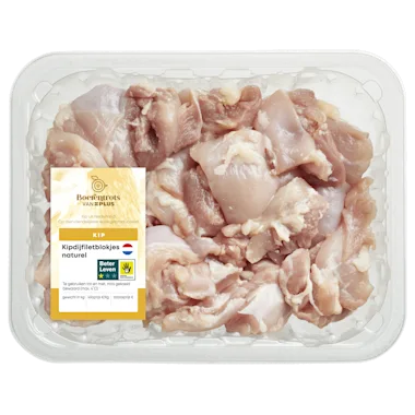 Koekenpan: Verhit boter of olie en bak de kipdijfiletblokjes rondom bruin en in ca. 8 minuten gaar. Regelmatig keren.