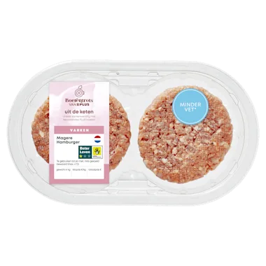 Magere hamburger met 1,7% erwt-, aardappel- en maïszetmeel en 0,8% erwtenvezel