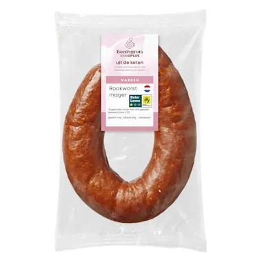 Ingrediënten :89% Varkensvlees°, water, zout, voedingszuur: E300/E326/E330, aardappelzetmeel, getextureerd veldbonen-eiwit, varkenseiwit, specerijen, dextrose, stabilisator: E451, gistextract, verdikkingsmiddel: E461, rook, conserveermiddel: E250, varkensdarm.