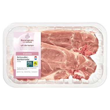 Bereidingswijze: Verwijder de verpakking. Koekenpan: Verhit boter en/of (olijf)olie en bak de schouderkarbonade in circa 10-15 minuten bruin en gaar. Regelmatig keren.