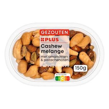 Gezouten mix van gebakken cashewnoten, gebakken amandelen en geroosterde pistachenoten.