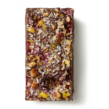 Ingrediënten :TARWEBLOEM, suiker, koolzaadolie, water, 13% zure kersenpuree, palmvet, TARWEZETMEEL, 2,0% magere cacaopoeder, 1,1% HAZELNOTEN, 1,1% PECANNOTEN, 1,1% PISTACHENOTEN, invertsuiker, 0,6% kokos, zonnebloemolie, glucosestroop, dextrine, rijsmiddel: E450/E500, aroma's, gemodificeerd maiszetmeel, zout, enzymen, dextrose, zuurteregelaar: E501/E330/E331, geleermiddel: pectinen, emulgator: E471.