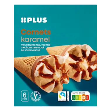 Cornets Karamel met slagroomijs, roomijs met karamelsmaak en karamelsaus