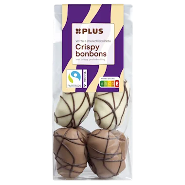 Melk- en witte chocolade gevuld met 47% crispy hazelnootpraliné vulling en gedecoreerd met pure chocolade