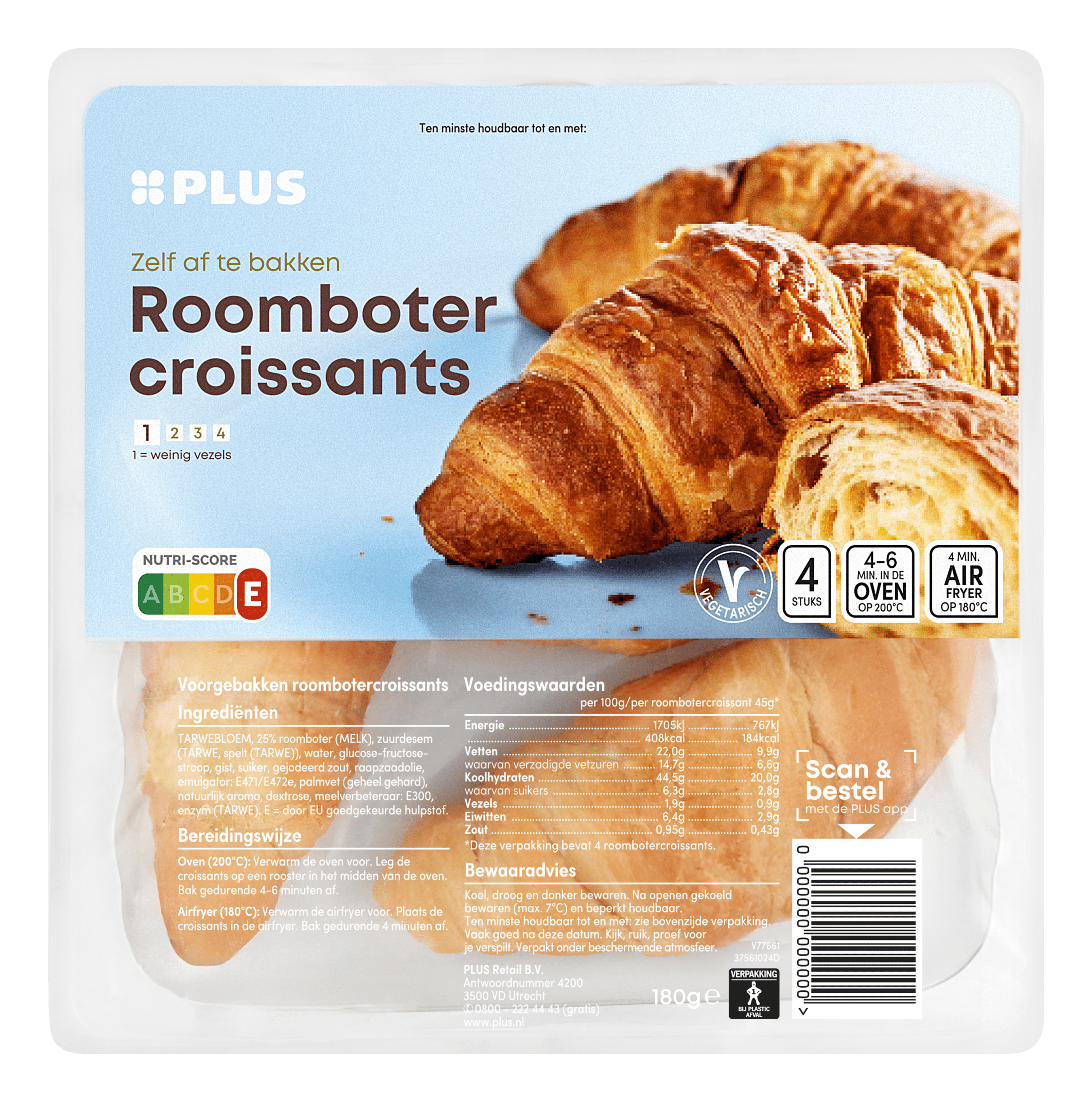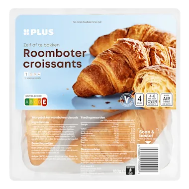 Oven (200°C): Verwarm de oven voor. Leg de croissants op een rooster in het midden van de oven. Bak gedurende 4-6 minuten af. Airfryer (180°C): Verwarm de airfryer voor. Leg de croissants in de airfryer. Bak gedurende 4 minuten af.