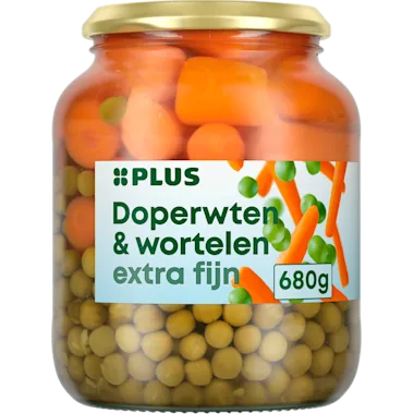 Ingrediënten :groenten in wisselende verhouding (doperwten, wortelen), water.