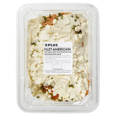 Ingrediënten: 73% Filet americain (66% rundvlees, water, raapzaadolie, voedingszuur: E260/E262/E326/E330, SCHARRELKIPPENEI-EIGEEL, tomatenpuree, zout, suiker, specerijen (MOSTERD), extract van paprika, glucosestroop, natuurazijn, zetmeel (rijst, aardappel), aroma's (MOSTERD), gedroogde groente (champignon, tomaat), dextrose, stabilisator: E331, gemodificeerd maïszetmeel, gehydrolyseerde plantaardige eiwitten (maïs, SOJA, koolzaad), verdikkingsmiddel: xanthaangom/guarpitmeel, gistextract, MELKEIWITTEN, conserveermiddel: E202, antioxidant: E300, specerijextracten (SELDERIJ, chilipeper, knoflook), lavasblad), 17% saus met truffelsmaak (koolzaadolie, water, zwarte olijven, azijn, SCHARRELKIPPENEI-EIGEEL, aroma's, gehydrolyseerd SOJA-EIWIT, zout, specerijen (MOSTERD), voedingszuur: E330/E270, melasse, moutazijn (GERST), dextrose, suiker, kruiden, knoflook, conserveermiddel: E202, vloeibare suiker, verdikkingsmiddel: E407a/E410/E412/E415, 0,02% truffelpuree, zwarte peperextract, antioxidant: E385, kleurstof: E150c, kaliumchloride), 5% Parmigiano Reggiano (rauwe KOEMELK, zout, stremsel), pijnboompitten, bieslook.