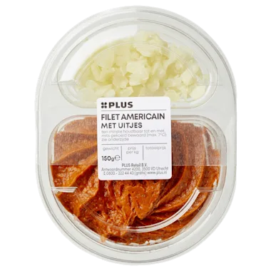 Ingrediënten :87% Filet americain (66% rundvlees, water, raapzaadolie, voedingszuur: E260/E262/E326/E330, SCHARRELKIPPENEI-EIGEEL, tomatenpuree, zout, extract van paprika, suiker, specerijen (o.a. MOSTERDZAAD), glucosestroop, azijn, gehydrolyseerde plantaardige eiwitten (raapzaad, koolzaad), zetmeel (rijst, aardappel), aroma's (MOSTERD), gedroogde groente (champignon, pastinaak), dextrose, stabilisator: E331, gemodificeerd maïszetmeel, verdikkingsmiddel: xanthaangom/guarpitmeel, gistextract, MELKEIWITTEN, conserveermiddel: E202, tomatenpoeder, antioxidant: E300, specerijextracten (SELDERIJ, chilipeper)), 13% ui.