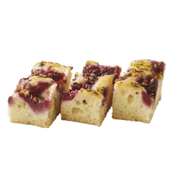 Frambozencake gevuld met custardvulling met pistachesmaak, gedecoreerd met pistachenootjes, ontdooid
