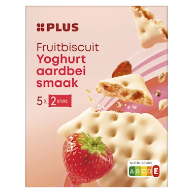 Biscuit met 20% yoghurtsmaaklaagje en vulling van 18% rozijnen, 6% krenten en 0,5% geconcentreerde aardbeipuree.