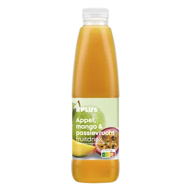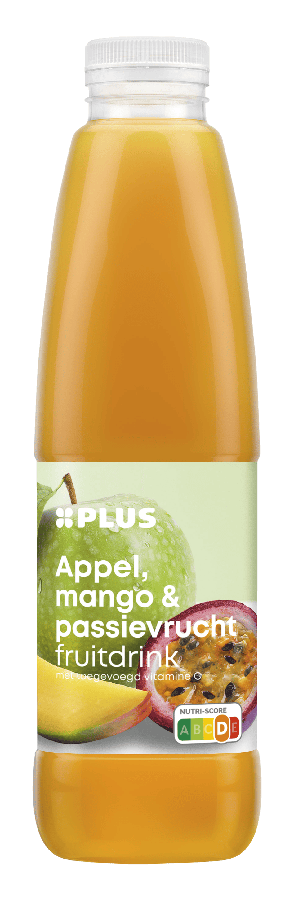 water, 28% appelsap uit concentraat, 6% mangopuree, 4% passievruchtensap uit concentraat, aroma's, zoetstof: cyclamaten/sucralose/acesulfaam-K, vitamine C.