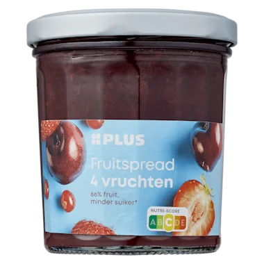 G’woon Fruitspread 4vruchten. 66% vruchten, bevat 49% minder suiker dan de gemiddelde extra jam.