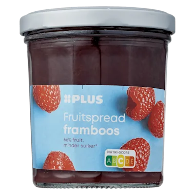 PLUS Fruitspread framboos. 66% fruit, bevat 50% minder suiker dan de gemiddelde extra jam