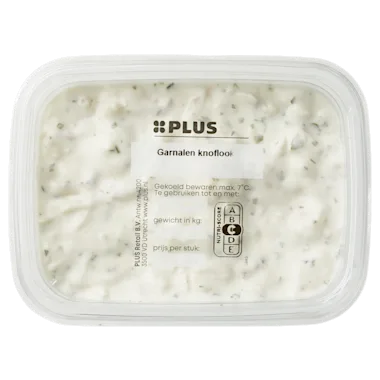 Ingrediënten :32% garnaal* (SCHAALDIEREN), raapzaadolie, water, 17% surimi (37% WITVIS**, water, gerehydrateerd VRIJE-UITLOOPKIPPPENEI-EIWITPOEDER, suiker, zonnebloemolie, zetmeel (TARWE, aardappel, maïs, erwt), koolzaadolie, stabilisator: E450/E451/E452/E420, SOJA-EIWIT, zout, natuurlijk aroma (bevat SCHAALDIEREN), gemodificeerd zetmeel (tapioca, aardappel), kleurstof: E160d), suiker, VRIJE-UITLOOPKIPPENEI-EIGEEL, 1,5% knoflook, maïszetmeel, azijn, zout, zuurteregelaar: E260/E270, citroensap, peterselie, gemodificeerd maïszetmeel, voedingszuur: E330, verdikkingsmiddel: E415/E412, conserveermiddel: E202/E211, dille, gistextract, MOSTERDZAAD, witte peper, kurkuma.