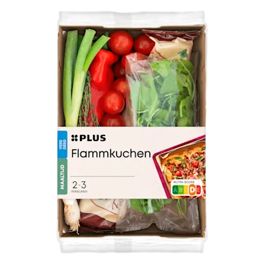 Groentepakket voor de bereiding van flammkuchen met flammkuchendeeg (260 g) en rucola (20 g).