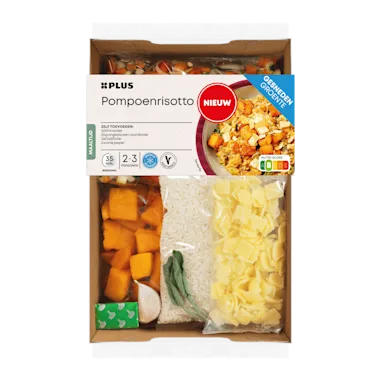 Groentepakket voor de bereiding van pompoenrisotto met een zakje pompoenblokjes (400g), een zakje gesneden groentemix (250g), een zakje risottorijst (150g), een zakje kaas (50g) en een groentebouillonblokje (10g)