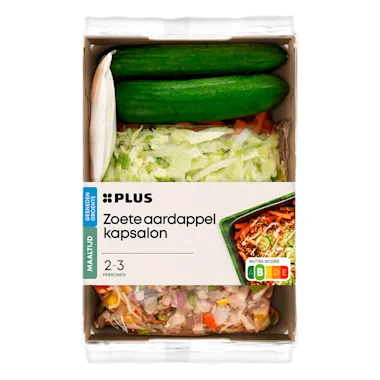 Pakket voor de bereiding van kapsalon zoete aardappel met een zakje gesneden zoete aardappel (400g), een zakje gesneden groentemix (215g), een mini komkommer, een zakje ijsbergsla (100g) en een zakje knoflooksaus (60g)