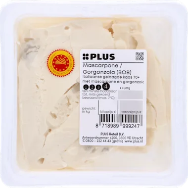 60% Mascarpone (room (MELK), voedingszuur: E330), 40% gorgonzola (gepasteuriseerde KOEMELK, zout, zuursel, dierlijk stremsel, blauwschimmelcultuur).