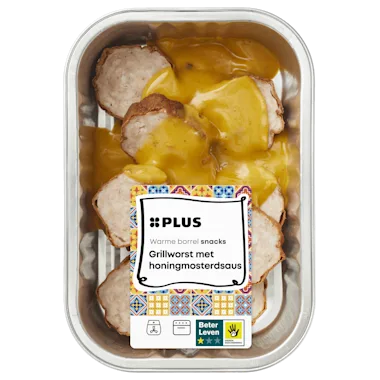 Ingrediënten :72% grillworst (86% varkensvlees, water, zout, aardappelzetmeel, specerijen, SOJA-EIWITISOLAAT, natuurlijk aroma, dextrose, maltodextrine, suiker, gehydrolyseerd SOJA-EIWIT, kippenvet, voedingszuur: E262/E270, aroma (bevat EI), uienextract, zonnebloemolie, emulgator: E450, smaakversterker: E621, antioxidant: E301, conserveermiddel: E250), 28% honing-mosterdsaus (water, raapzaadolie, suiker, 5% mosterd (water, 25% MOSTERDZAAD, natuurazijn, zout, suiker, specerijen), gemodificeerd maïszetmeel, natuurazijn, 2% bloemenhoning, melasse, tomatenpuree, zeezout, specerijen, sambal (rode peper, zout, zuurteregelaar: E260, conserveermiddel: E211), conserveermiddel: E202/E211, sojasaus (water, SOJABONEN, zout, TARWEBLOEM), verdikkingsmiddel: E415/E412, natuurlijk aroma, kruiden, voedingszuur: E330/E270, antioxidant: E385).