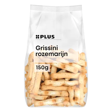 Plus Grissini rozemarijn met rozemarijn zijn lekker knapperige mini soepstengeltjes met een golvend uiterlijk. Ze zijn gekruid met rozemarijn en een heerlijke snack. Ideaal om te dippen en de perfecte toevoeging voor op de borrelplank.