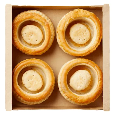 Oven (165°C). Verwijder de folie. Zet de pasteitjes in de baktray in de oven en verwarm ca. 15 minuten in een voorverwarmde oven. Vul de pastei met vulling naar keuze.