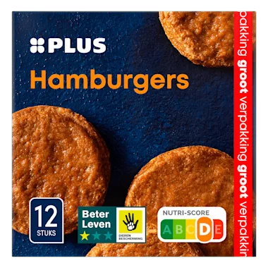 Voordeelverpakking. *Beter leven keurmerk. Het kippenseparatorvlees en varkensspek in deze PLUS hamburger is op diervriendelijkere wijze geproduceerd en daarom heeft de Dierenbescherming het Beter Leven keurmerk 1 ster toegekend aan dit product.