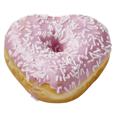 Gefrituurde deegwaren met 13% roze glazuur met aardbeiensmaak en suikerdecoratie. Ontdooid.