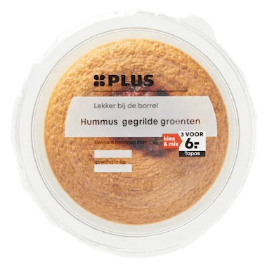 Ingrediënten :51% gerehydrateerde kikkererwten, 19% gegrilde rode paprika, water, 5% SESAMPASTA, 5% gebakken ui (90% ui, raapzaadolie), raapzaadolie, balsamico azijn (wijnazijn, druivenmost), specerijen, gemodificeerd aardappelzetmeel, suiker, knoflook, zout, zuurteregelaar: E267, peterselie, voedingszuur: E330/E270, conserveermiddel: E202, zwarte komijnzaad, verdikkingsmiddel: E415.