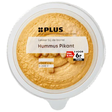Ingrediënten :57% kikkererwten, water, 8% SESAMPASTA, plantaardige oliën (zonnebloem, raapzaad, in wisselende verhouding), rode paprika, sweet pepper (zoete peper, suiker, zout, voedingszuur: E260, antioxidant: E330, verstevigingsmiddel: E509, conserveermiddel: E202/E211), 3% sambal badjak (37% rode chilipepers, uipoeder, zonnebloemolie, suiker, basterdsuiker, aroma, knoflookpoeder, conserveermiddel: E202/E211/E260), suiker, gebakken ui (ui, raapzaadolie), gebufferd azijnpoeder (conserverend ingrediënt), zout, voedingszuur: E330, komijn, conserveermiddel: E202.