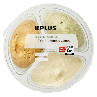 Ingrediënten :33% citroen hummus (51% gerehydrateerde kikkererwten, water, raapzaadolie, 9% SESAMPASTA, suiker, 2% citroensap, knoflook, zuurteregelaar: E267, zout, voedingszuur: E330/E270, conserveermiddel: E202/E224, komijn, natuurlijk citroenaroma), 33% groene-pesto hummus (57% gerehydrateerde kikkererwten, 15% groene pestomarinade (22% spinazie, raapzaadolie, 17% basilicum, 15% geraspte kaas (gepasteuriseerde MELK, aardappelzetmeel, zout, zuursel, dierlijk stremsel, kleurstof: E160b(ii)/E160a, conserveermiddel: E251), pijnboompitten, witte wijnazijn, knoflook, CASHEWNOTEN, zout, uienpoeder, conserveermiddel: E202), water, 7% SESAMPASTA, raapzaadolie, knoflook, zout, zuurteregelaar: E267, voedingszuur: E330/E270, conserveermiddel: E202), 33% wortel hummus (50% gerehydrateerde kikkererwten, 30% wortelpuree, water, plantaardige olie (raapzaad, rijst, SESAM), 2% SESAMPASTA, suiker, knoflook, zout, zuurteregelaar: E267, voedingszuur: E330/E270, komijn, conserveermiddel: E202).