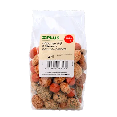 Ingrediënten :gemodificeerd maïszetmeel, 23% PINDA'S, TARWEBLOEM, glucosestroop, rietsuiker, maltodextrine, SESAMZAAD, SOJASAUS (water, SOJABONEN, TARWE, zout), rijsmiddel: E503, zout, aardappelzetmeel, zeewier, kleurstof: E141/E150a/E160c.