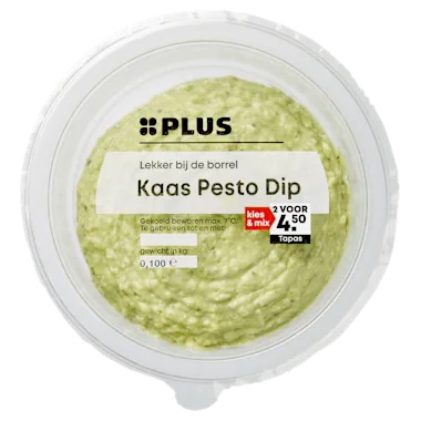 Dip met 39% mayonaise, 22% oude kaas, 8% roomkaas, 4% basilicum en 3% pijnboompitten