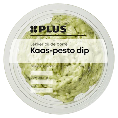 Dip met 39% mayonaise, 22% oude kaas, 8% roomkaas, 4% basilicum en 3% pijnboompitten