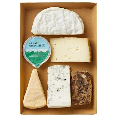 Kaasplateau met witschimmelkaas 45+, Danablu (BOB), blauwschimmelkaas 50+, koe- en schapenkaas 40+, Munster (BOB), gewassen korstkaas 50+, brood met vruchten en noten, Luikse stroop