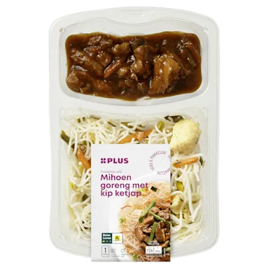 Ingrediënten :55% Mihoen Goreng (66% gekookte mihoen (rijstvermicelli (rijstbloem, maïszetmeel), water), 11% prei, plantaardige oliën (soja (volledig geraffineerde), raapzaad, SESAM), 7% VRIJE-UITLOOPEI**, 3,3% wortel, 3,3% taugé, 0,9% ui, zout, suiker, gistextract (gistextract, zout, zonnebloemolie)), 45% kip ketjap (35% gemarineerde kip (89% kipfilet*, aardappelzetmeel, sojaolie (volledig geraffineerd), suiker, zout, peper), water, 8% sperziebonen, wortel, suiker, sojaolie (volledig geraffineerd), knoflookpoeder, 2,6% ketjap (suiker, water, zout, SOJABONEN, TARWEMEEL, conserveermiddel: E211), ui, SOJASAUS (water, SOJABONEN, zout, TARWEBLOEM), aardappelzetmeel, nootmuskaat, gistextract (gistextract, zout, zonnebloemolie), zout).