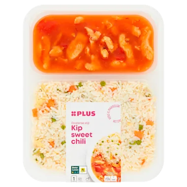 Ingrediënten :60% Gewokte rijst met ei en groenten (72% gekookte rijst (water, witte rijst, volledig geraffineerde sojaolie), 12% wortel, 6% VRIJE-UITLOOPKIPPENEI**, 6% doperwt, plantaardige oliën (volledig geraffineerde soja, raapzaad, SESAM, zonnebloem), suiker, zout, gistextract), 40% kip sweet chili (52% zoet-pittige saus (50% chilisaus (suiker, water, rode peper, voedingszuur: azijnzuur, knoflook, zout, verdikkingsmiddel: xanthaangom/guarpitmeel), 50% zoetzure saus (water, suiker, tomatenpuree, azijn, gemodificeerd aardappelzetmeel, ui, volledig geraffineerde sojaolie, TARWEMEEL, stemgember (gember, suikersiroop), knoflook, zout, gemalen PINDA, sambal (chilipeper, zout, water, conserveermiddel: E202, zuurteregelaar: E270), extractkorrels (SOJAHYDROLYSAAT, zout, aroma), ketchup (tomaten, azijn, suiker, zout, kruiden- en specerijenextract (SELDERIJ), specerijen), gistextract, zonnebloemolie, kleurstof: E150d)), 24% gemarineerde kip (kipfilet*, aardappelzetmeel, rijsmiddel: E500), 21% paprika, 1,7% rode peper, aardappelzetmeel).