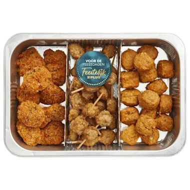 34% Kipgehaktballetje (87% kippenvlees*, rijstebloem, voedingszuur: E262/E326/E330, TARWEBLOEM, suiker, zout, aardappelzetmeel, tomatenpoeder, dextrose, kruiden, specerijextracten (paprika, rozemarijn), specerijen, limoenolie, gedroogde groenten (tomaat, wortel, paprika, ui), gedroogde knoflook, conserveermiddel: gebufferde azijn), 33% kipspies (83% kippenvlees*, specerijextracten (ui, rozemarijn), suiker, specerijen (o.a. MOSTERDZAAD), voedingszuur: E262/E326/E330, zout, zonnebloemolie, dextrose, voedingsvezel (aardappel, citrus, bamboe), rijstzetmeel, natuurlijk aroma (TARWE, SOJA), conserveermiddel: gebufferde azijn, citroensappoeder), 33% gepaneerde kip (77% kipdijfilet*, paneermix (TARWEBLOEM, gemodificeerd TARWEZETMEEL, zout, kruiden, specerijen, dextrose, gist, water, natuurlijk aroma (MELK), maltodextrine, korianderextract, suiker, gistextract, zonnebloemolie, GERSTEMOUTEXTRACT, emulgator: E472e, paprikaconcentraat, voedingszuur: E262/E326, conserveermiddel: gebufferde azijn, marinade (zout, maltodextrine, gebrande suiker, specerijen, rijstemeel, aardappelzetmeel, paprikaconcentraat, gistextract, aroma, gerookt zout, specerijextracten (ui, SELDERIJ), water, voedingszuur: citroenzuur)).