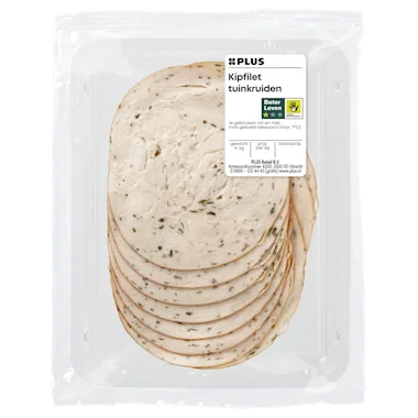 Ingrediënten :Ingrediënten: 76% kippenvlees*, water, voedingszuur (E326, E325, E330), 1,9% tuinbooneiwit, 0,2% peterselie, 0,1% bieslook, zout, aroma, conserveermiddel (E261, E250), emulgator (E473), stabilisator (E407, E450), dextrose, antioxidant (E301), lavasextract, kaliumchloride, aardappelzetmeel, rozemarijnextract, zonnebloemolie. *= Beter Leven keurmerk 1 ster.